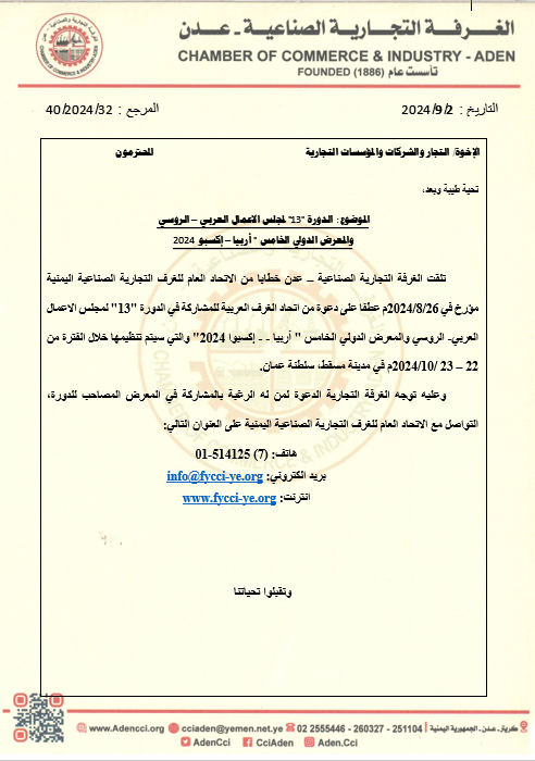 2 سبتمبر، 2024 2 سبتمبر، 2024الدورة “13” لمجلس الاعمال العربي – الروسي والمعرض الدولي الخامس ” أربيا – إكسبو 2024