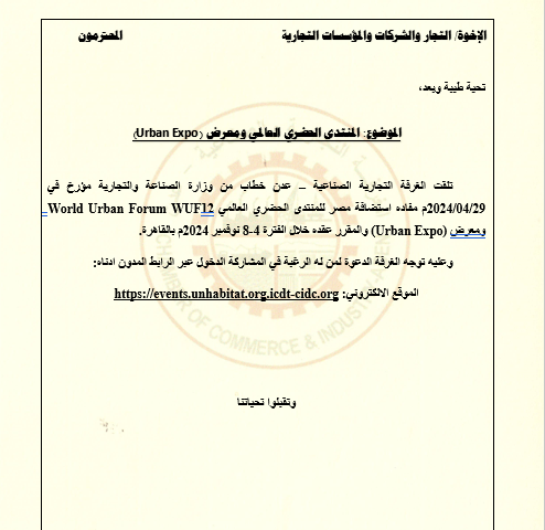 تلقت الغرفة التجارية الصناعية – عدن خطاب من وزارة الصناعة والتجارية مؤرخ في 29/04/2024م مفاده استضافة مصر للمنتدى الحضري العالمي World Urban Forum WUF12 ومعرض (Urban Expo) والمقرر عقده خلال الفترة 4-8 نوفمبر 2024م بالقاهرة.