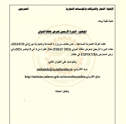 تلقت الغرفة التجارية الصناعية – عدن خطاب من وزارة الصناعة والتجارية مؤرخ في 19/5/2024م مفاده الدورة الأربعين لمعرض هافانا الدولي (FIHAV 2024) خلال الفترة من 4 الى 9 نوفمبر 2024م في ارض المعارض EXPOCUBA في هافانا.