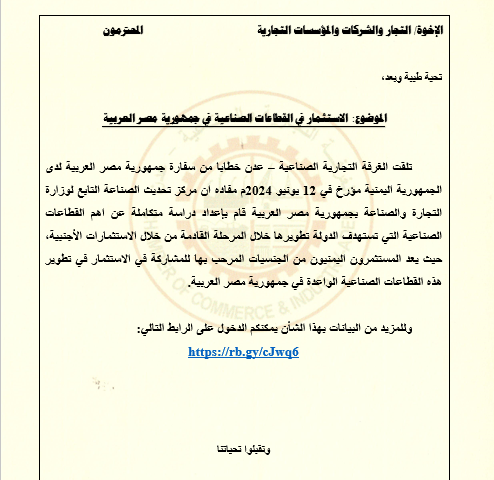 تلقت الغرفة التجارية الصناعية – عدن خطابا من سفارة جمهورية مصر العربية لدى الجمهورية اليمنية مؤرخ في 12 يونيو 2024م مفاده ان مركز تحديث الصناعة التابع لوزارة التجارة والصناعة بجمهورية مصر العربية قام بإعداد دراسة متكاملة عن اهم القطاعات الصناعية التي تستهدف الدولة تطويرها خلال المرحلة القادمة من خلال الاستثمارات الأجنبية، حيث يعد المستثمرون اليمنيون من الجنسيات المرحب بها للمشاركة في الاستثمار في تطوير هذه القطاعات الصناعية الواعدة في جمهورية مصر العربية.