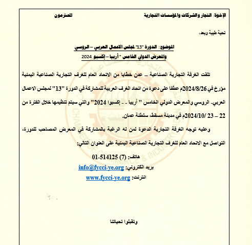 تلقت الغرفة التجارية الصناعية – عدن خطابا من الاتحاد العام للغرف التجارية الصناعية اليمنية مؤرخ في 26/8/2024م عطفا على دعوة من اتحاد الغرف العربية للمشاركة في الدورة “13” لمجلس الاعمال العربي- الروسي والمعرض الدولي الخامس ” أربيا – – إكسبوا 2024″ والتي سيتم تنظيمها خلال الفترة من 22 – 23 /10/2024م في مدينة مسقط، سلطنة عمان.