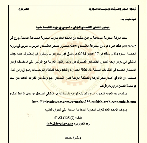 تلقت الغرفة التجارية الصناعية – عدن خطابا من الاتحاد العام للغرف التجارية الصناعية اليمنية مؤرخ في 2/9/2024م عطفا على دعوة من مجموعة الاقتصاد والاعمال لحضور الملتقى الاقتصادي التركي – العربي في دورته الخامسة عشرة والذي سيقام في 17 أكتوبر 2024م في فندق فور سيزونز – بوسفور في إسطنبول. حيث يهدف الملتقى الى تعزيز أوجه التعاون الاقتصادي المشترك بين تركيا والدول العربية مع التركيز على استكشاف فرص الاستثمار الجديدة في القطاعات الناشئة مثل الطاقة الخضراء والتكنولوجيا المالية واللوجستيات وأسواق رأس المال مستفيدا من الموقع الاستراتيجي لتركيا والمنطقة العربية كممر اقتصادي مهم يربط بين القارات الثلاث بين اسيا (وخاصة الصين) واوربا وافريقيا.