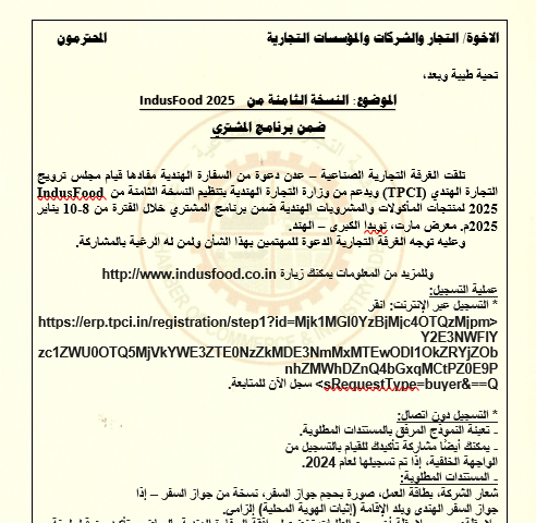 تلقت الغرفة التجارية الصناعية – عدن دعوة من السفارة الهندية مفادها قيام مجلس ترويج التجارة الهندي (TPCI) وبدعم من وزارة التجارة الهندية بتنظيم النسخة الثامنة من IndusFood 2025 لمنتجات المأكولات والمشروبات الهندية ضمن برنامج المشتري خلال الفترة من 8-10 يناير 2025م. معرض مارت، نويدا الكبرى – الهند.