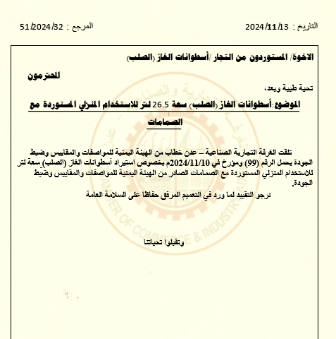 تلقت الغرفة التجارية الصناعية – عدن خطاب من الهيئة اليمنية للمواصفات والمقاييس وضبط الجودة يحمل الرقم (99) ومؤرخ في 10/11/2024م بخصوص استيراد أسطوانات الغاز (الصلب) سعة لتر