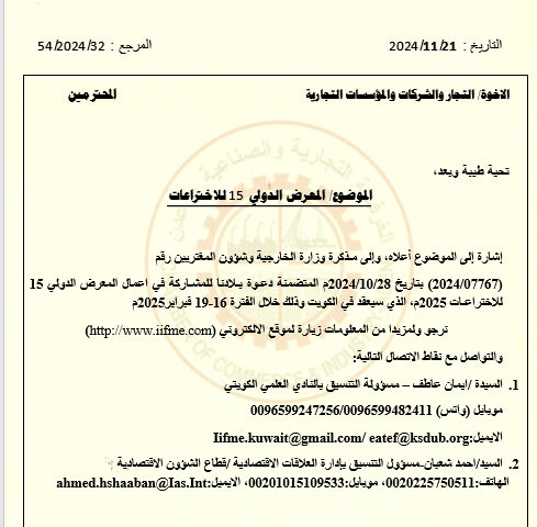 إشارة إلى الموضوع أعلاه، وإلى مـذكرة وزارة الخارجية وشؤون المغتربين رقم (07767/2024) بتاريخ 28/10/2024م المتضمنة دعـوة بـلادنا للمشـاركة في اعمال المعرض الدولي 15 للاختراعـات 2025م، الذي سيعقد في الكويت وذلك خلال الفترة 16-19 فبراير2025م .