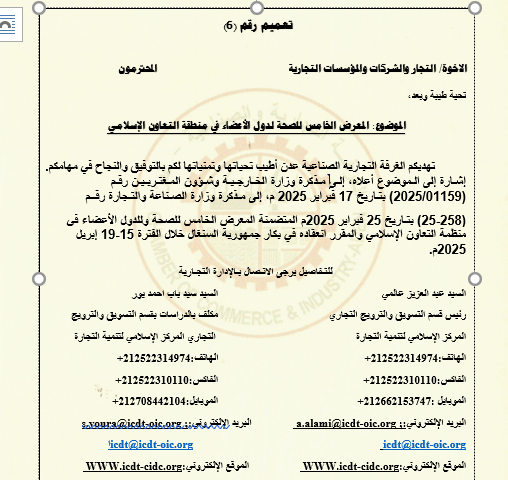 (258-25) بتـاريخ 25 فبراير 2025م المتضمنة المعرض الخامس للصحة وللدول الأعضاء في منظمة التعاون الإسلامي والمقرر انعقاده في بكار جمهورية السنغال خلال الفترة 15-19 إبريل 2025م.