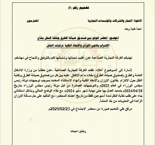 الموضوع: المحضر الموقع بين صندوق صيانة الطرق ونقابة النقل بشأن الالتزام بقانون الاوزان والابعاد الكلية لمركبات النقل