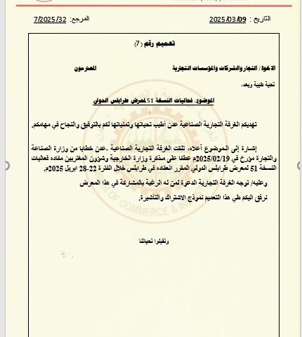 الاخوة/ التجار والشركات والمؤسسات التجارية المحترمون تحية طيبة وبعد، الموضوع: فعاليات النسخة 51 لمعرض طرابلس الدولي تهديكم الغرفة التجارية الصناعية عدن أطيب تحياتها وتمنياتها لكم بالتوفيق والنجاح في مهامكم. إشـارة إلى الـموضوع أعلاه، تلقت الغرفة التجارية الصناعية -عدن خطابا من وزارة الصناعة والتجارة مؤرخ في 19/02/2025م عطفا على مـذكرة وزارة الخارجية وشؤون المغتربين مفاده فعاليات النسخة 51 لمعرض طرابلس الدولي المقرر انعقاده في طرابلس خلال الفترة 22-28 ابريل 2025م. وعليه/ توجه الغرفة التجارية الدعوة لمن له الرغبة بالمشاركة في هذا المعرض نرفق اليكم طي هذا التعميم نموذج الاشتراك والتأشيرة. وتقبلوا تحياتنا |