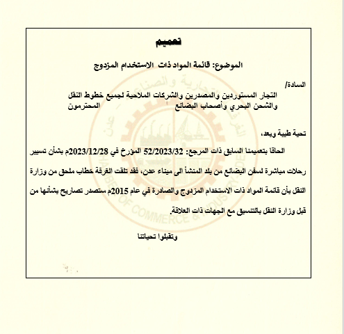 إلحاقا بتعميمنا السابق ذات المرجع: 32/2023/52 المؤرخ في 28/12/2023م بشأن تسيير رحلات مباشرة لسفن البضائع من بلد المنشأ إلى ميناء عدن، فقد تلقت الغرفة خطاب ملحق من وزارة النقل بأن قائمة المواد ذات الاستخدام المزدوج والصادرة في عام 2015م ستصدر تصاريح بشأنها من قبل وزارة النقل بالتنسيق مع الجهات ذات العلاقة.