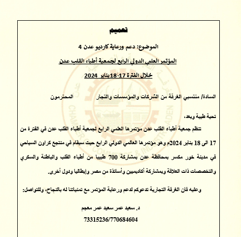 تنظم جمعية أطباء القلب عدن مؤتمرها العلمي الرابع لجمعية أطباء القلب عدن في الفترة من 17 الى 18 يناير 2024م وهو مؤتمرها العالمي الدولي الرابع حيث سيقام في منتجع كراون السياحي في مدينة خور مكسر بمحافظة عدن بمشاركة 700 طبيبا من أطباء القلب والباطنة والسكري والتخصصات ذات العلاقة وبمشاركة أكاديميين وأساتذة من مصر وإيطاليا ودول أخرى.