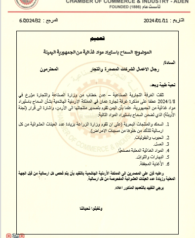 تلقت الغرفة التجارية الصناعية – عدن خطاب من وزارة الصناعة والتجارة مؤرخ في 8/1/2024 عطفا على مذكرة غرفة تجارة عمان في المملكة الاردنية الهاشمية بشأن السماح باستيراد مواد غذائية من الجمهورية، علما بأن اليمن تقوم بتصدير منتجاتها الى الأردن، واشارة الى قرار (لجنة الأوبئة) الذي تضمن السماح باستيراد المواد التالية: