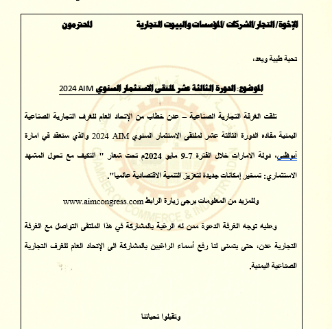 تلقت الغرفة التجارية الصناعية – عدن خطاب من الإتحاد العام للغرف التجارية الصناعية اليمنية مفاده الدورة الثالثة عشر لملتقى الاستثمار السنوي 2024 AIM والذي ستعقد في امارة أبوظبي، دولة الامارات خلال الفترة 7-9 مايو 2024م تحت شعار ” التكيف مع تحول المشهد الاستثماري: تسخير إمكانات جديدة لتعزيز التنمية الاقتصادية عالميا”.