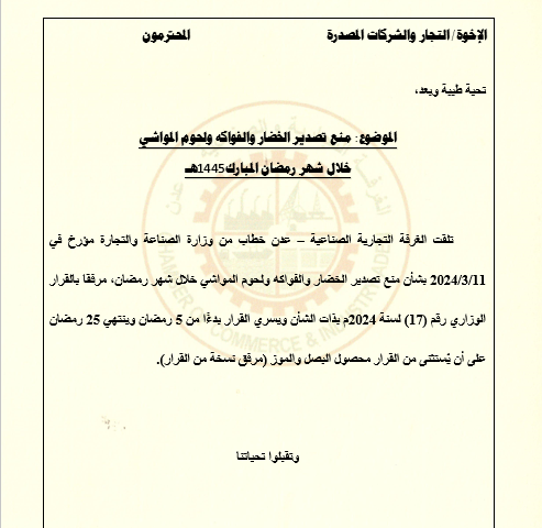 تلقت الغرفة التجارية الصناعية – عدن خطاب من وزارة الصناعة والتجارة مؤرخ في 11/3/2024 بشأن منع تصدير الخضار والفواكه ولحوم المواشي خلال شهر رمضان، مرفقا بالقرار الوزاري رقم (17) لسنة 2024م بذات الشأن ويسري القرار بدءًا من 5 رمضان وينتهي 25 رمضان على أن يُستثنى من القرار محصول البصل والموز (مرفق نسخة من القرار).
